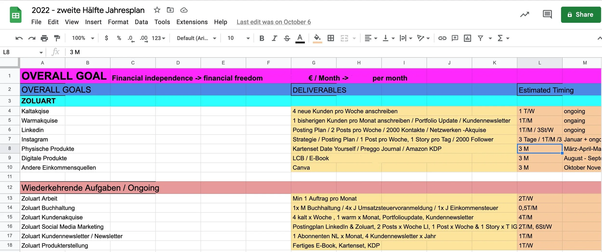 Next I have goals, deliverables and estimated timing. Let’s dive into an example: I need x amount of money per month, so I need to get new clients regularly. The overall goal is client acquisition, the deliverables are the concrete numbers I think I need to achieve my goal. For instance: writing 4 cold and one warm lead per week. I estimate one day per week for the cold leads (which gives me 2h per pitch) and 1 day per month per warm lead, which includes portfolio updates and client newsletters. Do you see how concrete those tasks are? That’s how tangible they need to be for me to really tackle them.